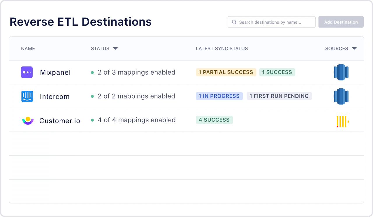 Automatically sync data from your warehouse out to the destination tools you rely on to engage customers, personalize their experience and increase loyalty.